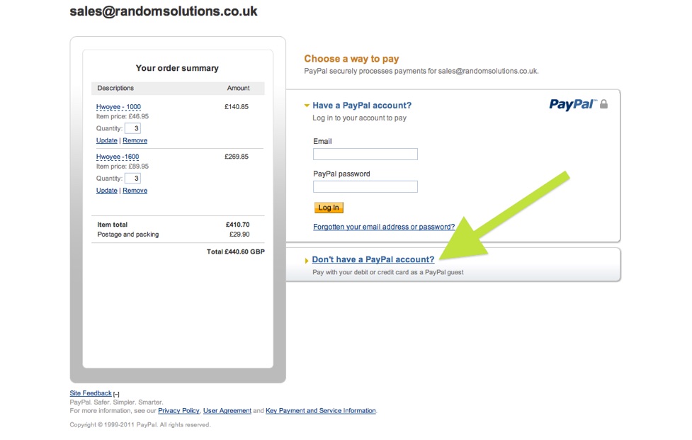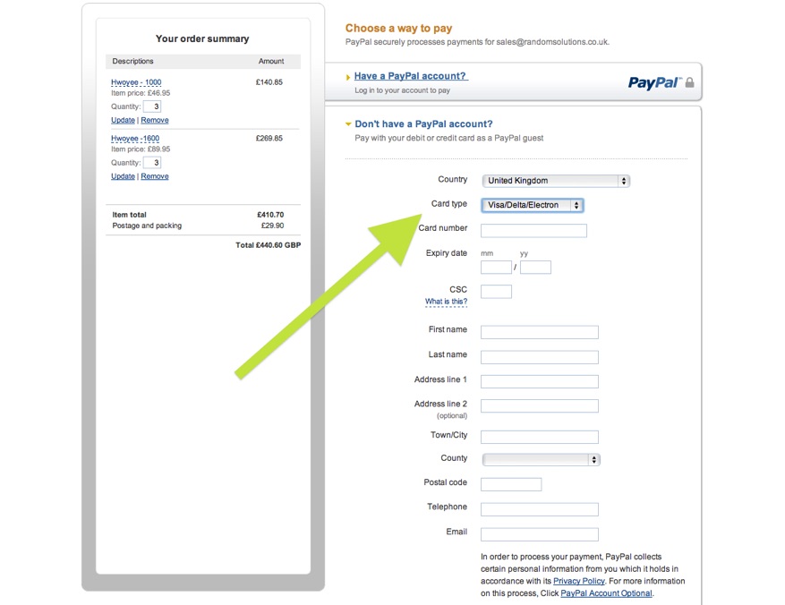 If you want to pay by credit card without opening a PayPal account simply click on the “Check Out” or the “PayPal” buttons on the screen above and then click on “Don’t have a PayPal Account - as in the screen below.